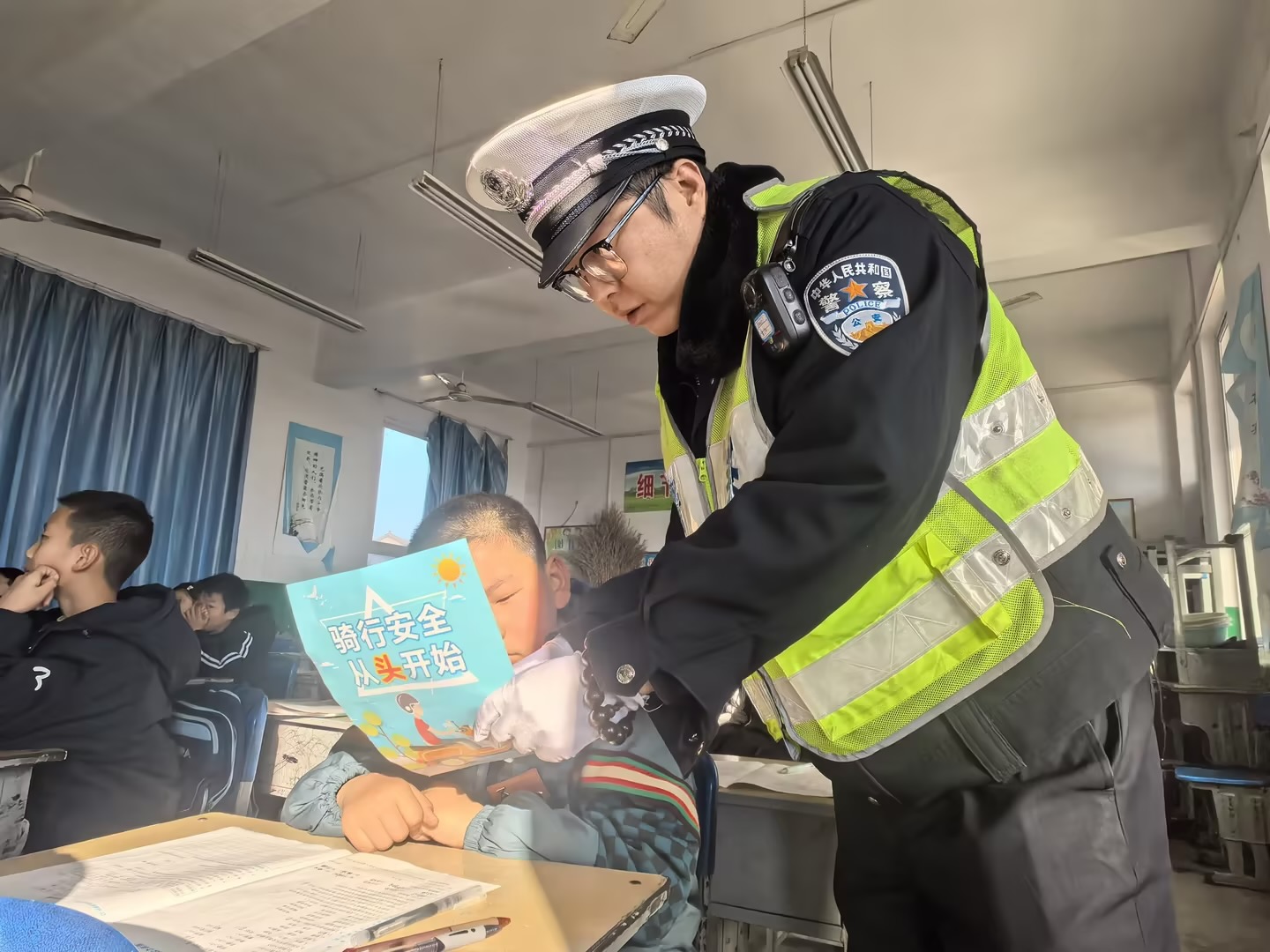 活动现场,民警结合乡镇道路通行特点与学生出行习惯,用通俗易懂的语言讲解交通安全知识。从如何安全横穿马路、正确识别交通信号灯,到规避马路追逐打闹、拒绝乘坐超员超载车辆等危险行为,民警逐一细致说明,引导学生认清日常出行中的安全隐患,掌握避险技巧。为强化宣传教育效果,民警设置互动问答环节,围绕“遇到车辆盲区该怎么办”“乘坐电动车要注意什么”等问题与学生交流,大家踊跃举手,在轻松互动中加深知识记忆。同时,民警向师生发放宣传手册,鼓励学生当好“交通安全宣传员”,将所学知识分享给家人。