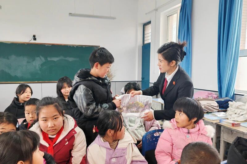 课堂上,干警紧扣校园安全、防欺凌、网络安全等高频话题,通过情景设问的方式,与孩子们展开热烈互动。“小明拿了同学的橡皮,是盗窃吗?”“压岁钱究竟归谁管?”面对一个个贴近生活的“灵魂拷问”,同学们举手踊跃、对答如流,干警还特别准备了书包、帆布包、笔记本、签字笔等小礼物,现场欢声笑语不断,法治思维在一问一答中悄然萌芽。