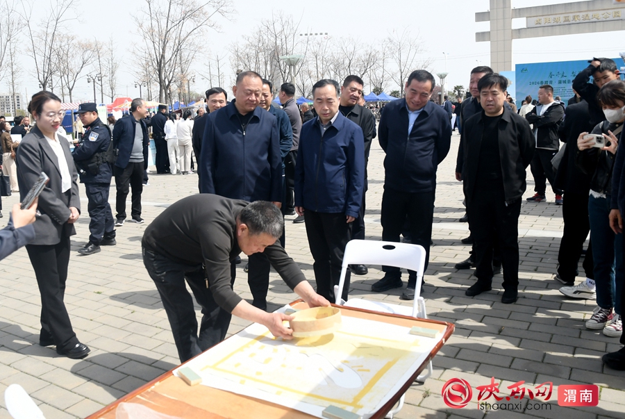 11时30分,活动在流沙的光影流动中将氛围推向高潮,点燃全场的热情。活动现场周围,农特产品推销、非遗文化展示、特色美食体验等展位前人头攒动,市民和游客深度体验蒲城风土人情和文化魅力。蒲城酥梨、椽头蒸馍、蒲城面花等本地特色产品琳琅满目,工作人员热情地介绍产品特点、讲解制作工艺;非遗文化展示区中,火药画、麦秆画、土织布等蒲城代表性非遗项目集中亮相,非遗传承人身临其境现场演示技艺、讲解非遗历史,邀请游客互动体验,让大家在近距离感受非遗魅力的同时,加深对蒲城传统文化的认知与认同;特色美食体验区里,各类关中特色小吃香气扑鼻,吸引游客驻足品尝,沉浸式感受蒲城的风土人情和烟火气息,进一步丰富了活动体验,彰显了蒲城文旅融合的多元活力,为春日踏青活动增添了浓厚的烟火氛围。